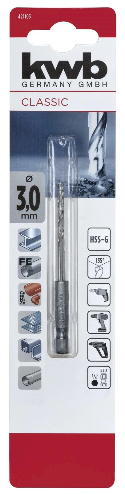 Für Stahl, Stahlguss, Temperguss, Sintereisen, Nichteisenmetalle, Hartkunststoffe. Mit Sechskantaufnahme 1/4" für Akku-Schrauber. Spitzwinkel 135°. Material: HSS. Norm: ISO 1173.