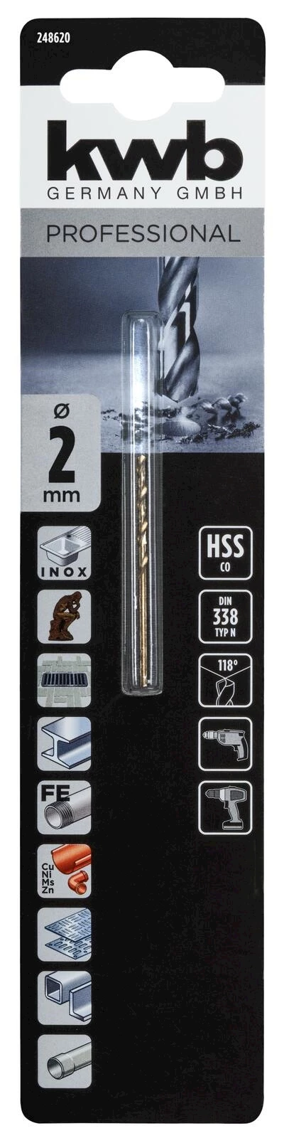 Für Stahl, Nirosta rostfreier Stahl V2A/V4A, Grauguss und Stahlguss, Bronze, Kunststoffe. Extreme Wärmebeständigkeit. Material: HSS, Cobalt legiert. Norm: DIN 338, DIN 1412 C.