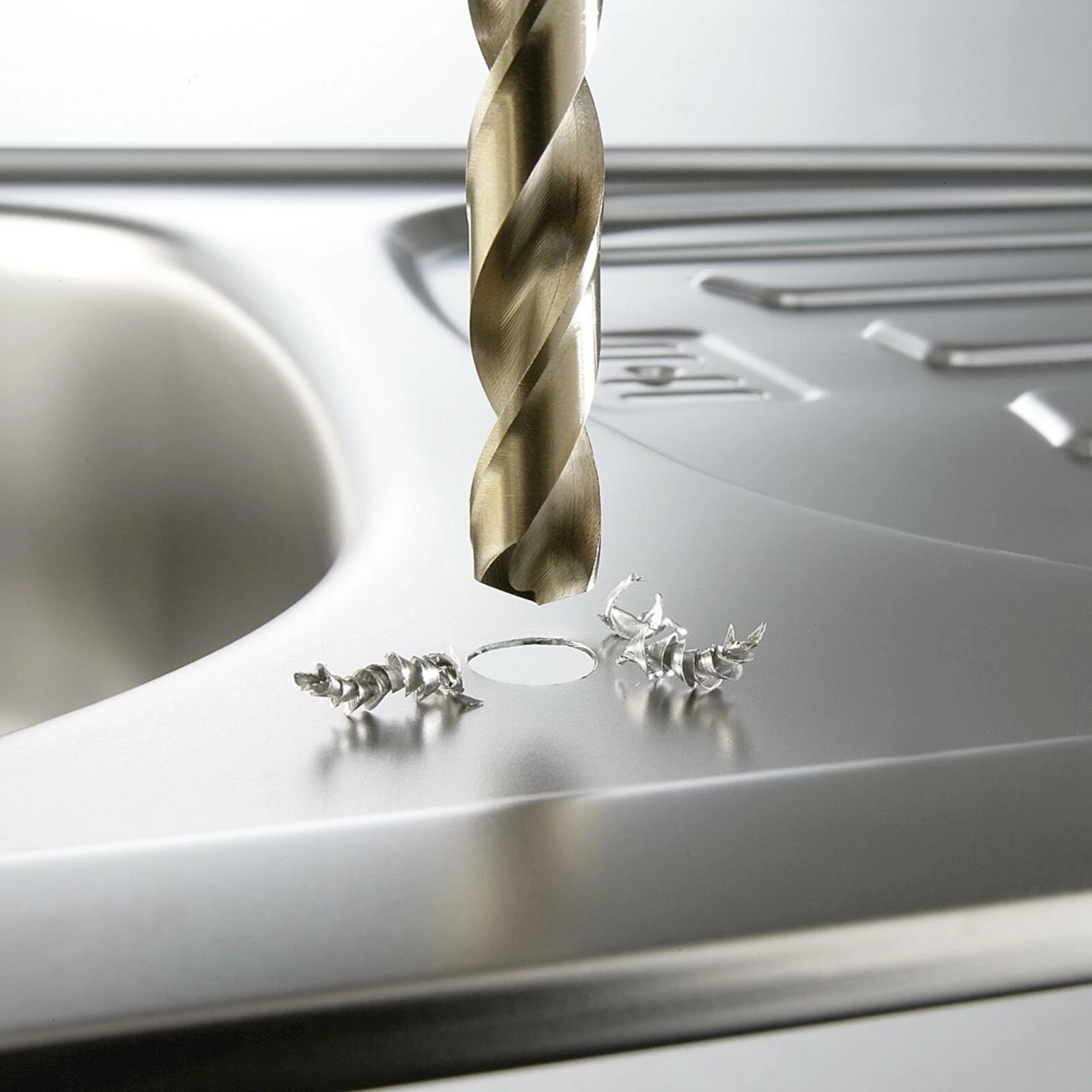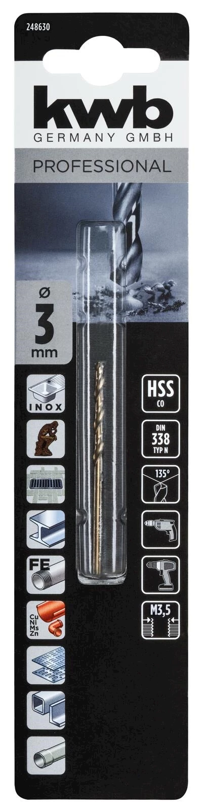 Für Stahl, Nirosta rostfreier Stahl V2A/V4A, Grauguss und Stahlguss, Bronze, Kunststoffe. Extreme Wärmebeständigkeit. Material: HSS, Cobalt legiert. Norm: DIN 338, DIN 1412 C.