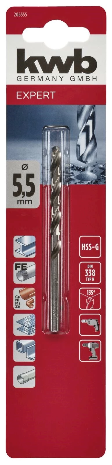 Für Stahl, Stahlguss, Temperguss, Sintereisen, Nichteisenmetalle, Hartkunststoffe. Präzisionsgeschliffen, Spitzwinkel 135°, selbstzentrierend. Material: HSS. Norm: DIN 338, DIN 1412 C.