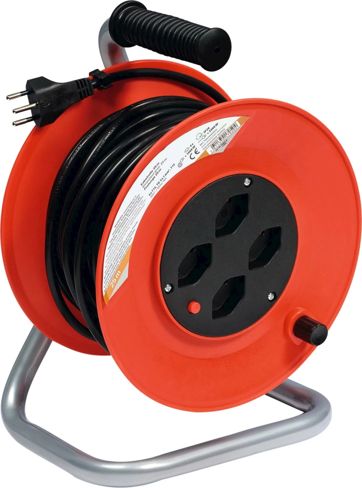 25 Meter Kabelrolle mit ergonomischem Griff ausgestattet für einfachen Transport. Die 4 × T13 Anschlüsse mit IP 20 Zertifizierung sind ausgezeichnet für Kabelverlängerungen im Innenbereich geeignet. Wichtig: Kabelrolle nur im ausgerollten Zustand verwenden.