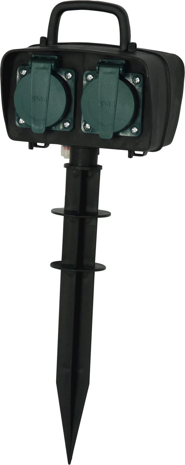 Steckdose an einem Erdpfahl für Ihre Grünfläche oder Garten, mit 4 × T13 einphasig angeschlossene Buchsen und 3 Meter Kabel. Die Steckdose ist gegen Spritzwasser aus allen Richtungen und das Eindringen von Gegenstände ab einem Millimeter geschützt.