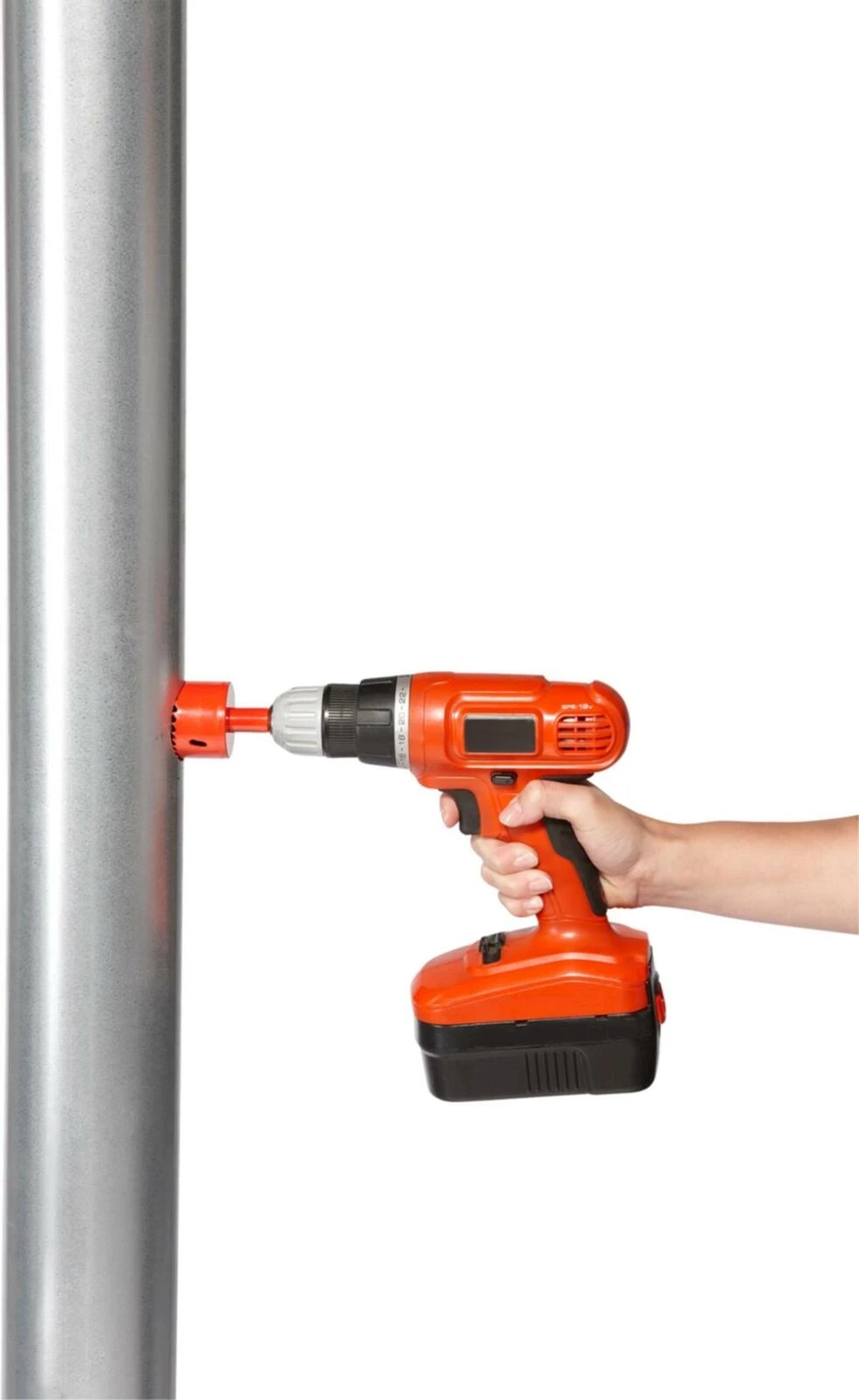 Die Montage ist sehr einfach: Mit dem mitgelieferten Bohrer wird ein Loch ins Fallrohr gebohrt, anschliessend wird der Regensammler eingesetzt, ohne das Fallrohr entfernen zu müssen.