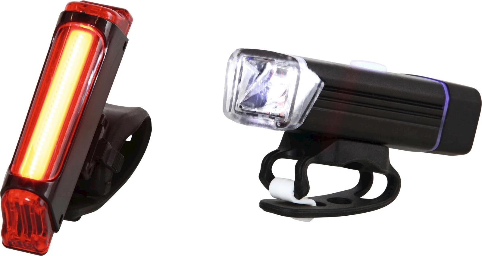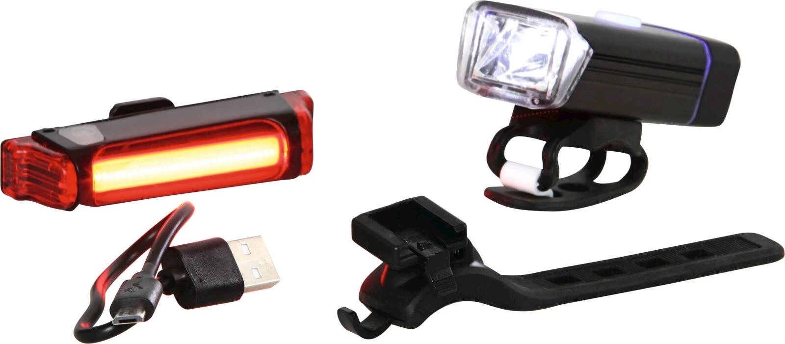 Das aufladbare Lichtset besteht aus dem Front- und Rücklicht mit USB-Ladekabel und Stecker. Um das Frontlicht aufzuladen, muss die Kunststoffkappe entfernt werden, anschliessend kann das Licht an einem beliebigen USB-Eingang angeschlossen werden. Beim Frontlicht kann man aus vier verschiedenen Modi und beim Rücklicht verfügt über drei Modi. Mit dem starken Frontlicht aus 220 Lumen sieht man die Fahrbahn sehr gut und auch durch das Rücklicht wird man von jedem Strassenteilnehmer wahrgenommen. Die Leuchtdauer des Rücklichts beträgt ca. 2 bis 3 Stunden. Beim Frontlicht hält der Akku bei geringer Helligkeitseinstellung ca. 4 Stunden, bei hoher Helligkeit 2 Stunden und im Blitzlicht Modus ungefähr 4 bis 5 Stunden.