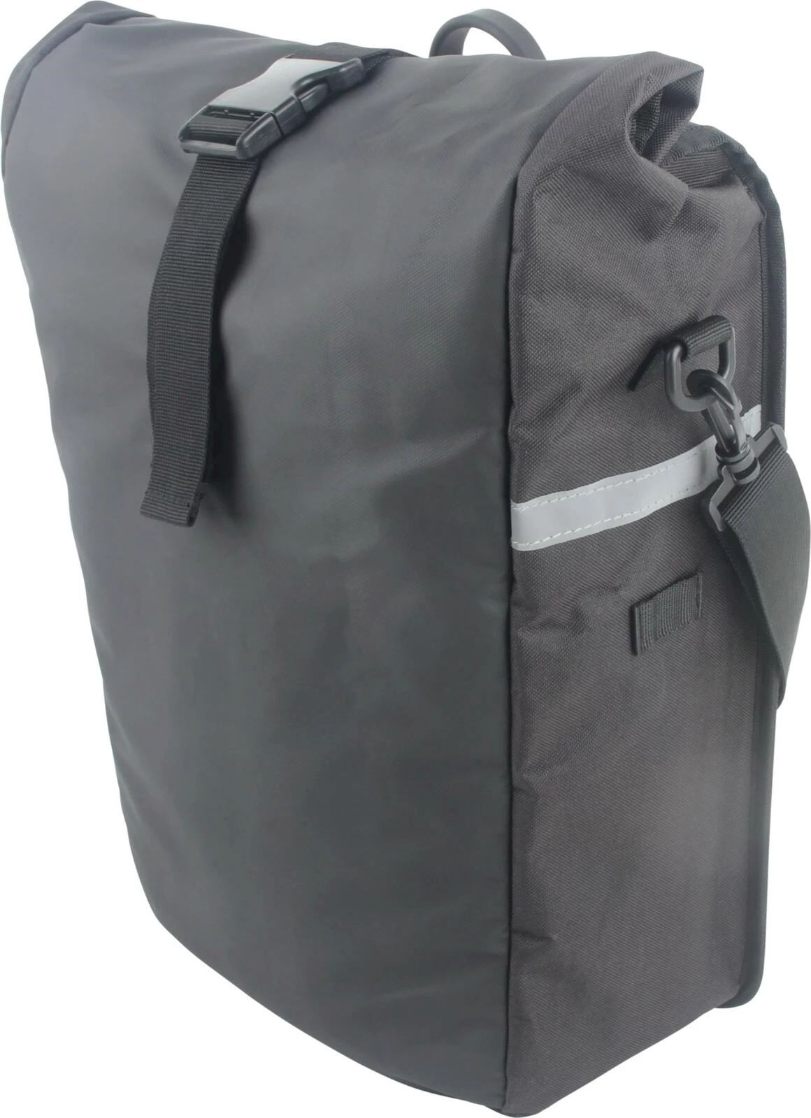 Praktische Tasche aus PU und Polyester mit variabler Befestigungsvorrichtung für Velo-Gepäckträger. Die Fahrradtasche ist einfach ohne Werkzeug montier- und demontierbar und passt an die meisten handelsüblichen Gepäckträger. Sie wird an den selbstarretierenden Bügeln oben eingehängt und im unteren Bereich mit der Variablen Klammer zusätzlich fixiert. Sie verfügt über eine Seitentasche und ist für eine gute Sichtbarkeit mit reflektierenden Streifen versehen. Um den Inhalt optimal zu schützen, kann die Tasche oben eingerollt und mit der Schnalle verschlossen werden. Im Lieferumfang ist ein Tragriemen (Schultergurt) und ein Regenüberzug enthalten. Max. Belastung 12 kg. Masse H×B×T: 58 × 31 × 13 cm. Gewicht: 940 g.