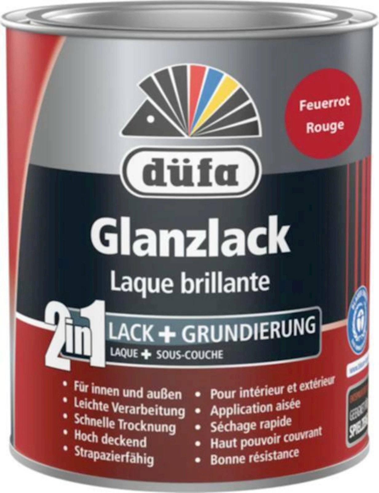 düfa 2in1 Glanzlack ist ein Acryllack für dekorative und schützende Lackierungen im Innen- und Aussenbereich. Hervorragend geeignet für Beschichtungen auf grundiertem Holz und Metall, anstrichgeeignete Kunststoffe (z.B. Hart PVC), mineralischen Untergründen, Warmwasserheizkörper (nur Bunttöne) sowie für Renovierungsanstriche auf allen tragfähigen Altanstrichen. Mit dem Blauen Engel ausgezeichnet. Nach DIN EN 71.3 für Kinderspielzeug geeignet.