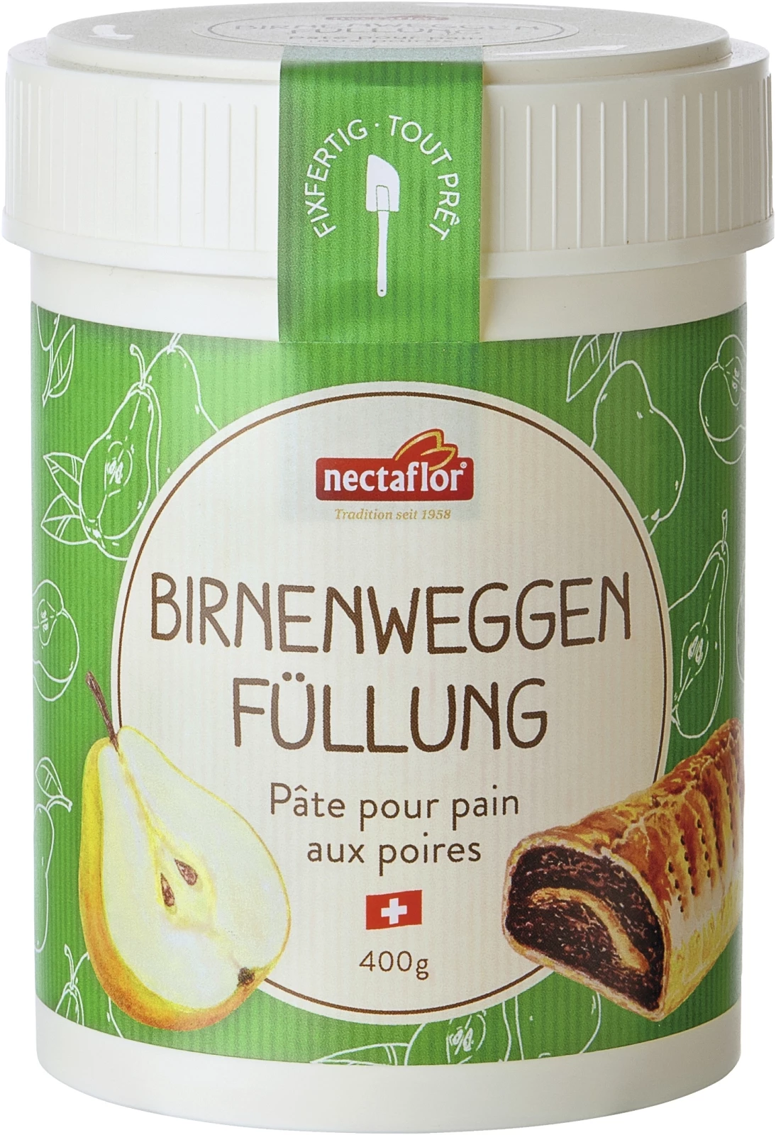 Die nectaflor Birnenweggenfüllung ist eine fixfertige, aromatische und fruchtige Backmasse aus Schweizer Birnen. Die schmackhafte Fruchtbackmasse eignet sich hervorragend für die Füllung von Birnenweggen. Die gut streichbare Füllung lässt sich für verschiedenste feine Gebäcke einsetzen.