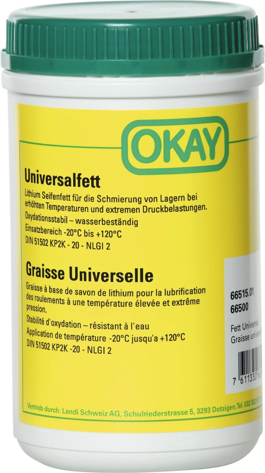 Hochwertiges Universalfett auf Lithium-Seifenfettbasis. Für die Schmierung von Gleit- und Wälzlagern in normalen Drehzahlbereichen in Maschinen, Apparaten und Fahrzeugen geeignet. Der Temperatur-Einsatzbereich liegt bei -20 ºC bis 135 ºC. Das Universalfett bietet ausgezeichneten Verschleiss- und Korrosionsschutz.