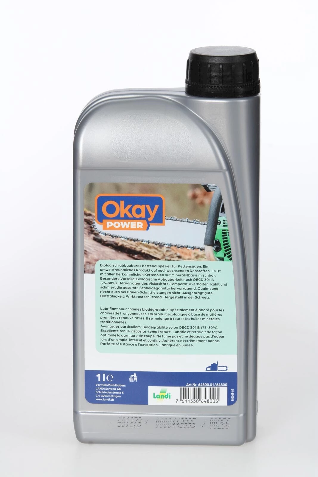 Das Kettensägenhaftöl Bio Okay Power ist auf der Basis nachwachsender Rohstoffe aufgebaut und ist dadurch rasch biologisch abbaubar. Gut durchdachte Additivierung sorgt für hervorragendes Haftvermögen, ausgeprägten Verschleissschutz und optimale Schmierfähigkeit. Das günstige Viskositäts-Temperatur-Verhalten gewährleistet den Ganzjahres-Einsatz bei verschiedensten Aussentemperaturen. Das Kettensägenhaftöl Bio Okay Power wurde speziell zur Schmierung von Hochleistungs-Motor-Kettensägen aller Fabrikate entwickelt. Es ermöglicht eine optimale Vollschmierung im Ganzjahres-Einsatz, auch unter erschwerten Einsatzbedingungen. Aufgrund hoher Leistungsreserven ist dies auch beim Sägen von Hartholz gewährleistet. Es ist mit allen herkömmlichen Kettenölen auf Mineralölbasis mischbar, frei von umweltbedenklichen Stoffen und hautverträglich. Das Bio Kettensägeöl bietet optimalen Verschleiss- und Korrosionsschutz an Ketten und Gleitflächen. Das Öl schmiert auch zuverlässig bei Tieftemperaturen, verhält sich auch beim Dauerschnitt qualm- und geruchsfrei. Der Schmierfilm verhält sich stabil, auch bei längerer Lagerung, dringt gut in die Kettenglieder ein und schützt vor Rostbildung. Hergestellt in der Schweiz.