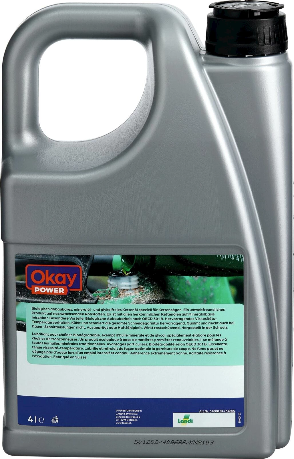 Das Okay Power Bio-Kettensägeöl auf pflanzlicher Basis ist ein biologisch abbaubares, mineralöl- und glykolfreies Kettenöl speziell für Motorsägen. Ein völlig neues, umweltfreundliches Produkt auf Basis eines sorgfältig ausgewählten pflanzlichen Öls. Es ist mit allen herkömmlichen Kettenölen auf Mineralölbasis mischbar. Herstellervorschriften beachten.