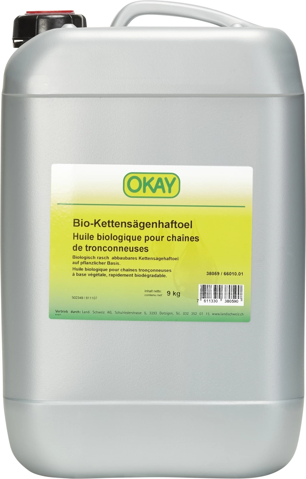 Das Kettensägenhaftöl Bio Okay ist auf der Basis nachwachsender Rohstoffe aufgebaut und ist dadurch rasch biologisch abbaubar. Gut durchdachte Additivierung sorgt für hervorragendes Haftvermögen, ausgeprägten Verschleissschutz und optimale Schmierfähigkeit. Das günstige Viskositäts-Temperatur-verhalten gewährleistet den Ganzjahres-Einsatz bei verschiedensten Aussentemperaturen. Das Kettensägenhaftöl Bio Okay wurden speziell zur Schmierung von Hochleistungs-Motor-Kettensägen aller Fabrikate entwickelt. Es ermöglicht eine optimale Vollschmierung im Ganzjahres-Einsatz, auch unter erschwerten Einsatzbedingungen. Aufgrund hoher Leistungsreserven ist dies auch beim Sägen von Hartholz gewährleistet. Es ist mit allen herkömmlichen Kettenölen auf Mineralölbasis mischbar, frei von umweltbedenklichen Stoffen und hautverträglich. Das Bio Kettensägeöl bietet optimalen Verschleiss- und Korrosionsschutz an Ketten und Gleitflächen. Das Öl schmiert auch zuverlässig bei Tieftemperaturen, verhält sich auch beim Dauerschnitt Qualm- und geruchsfrei. Der Schmierfilm verhält sich stabil, auch bei längerer längerer Lagerung und dringt gut in die Kettenglieder ein.