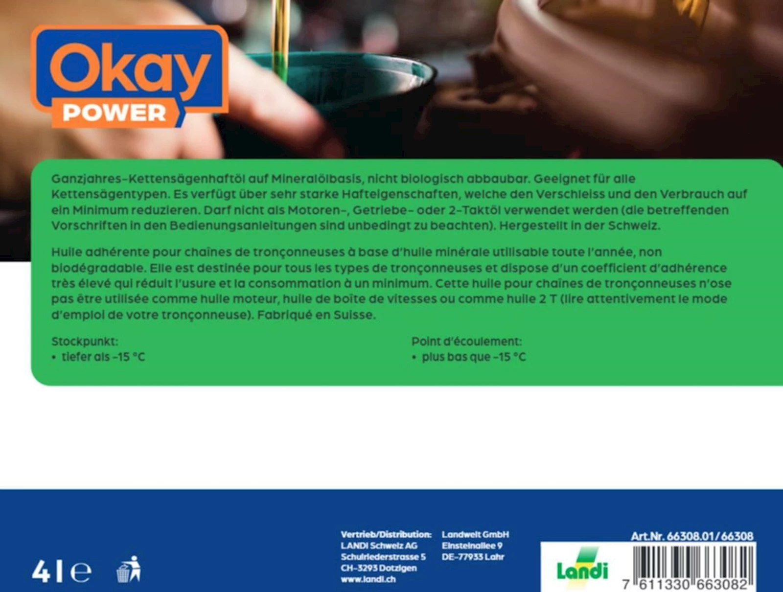Das Okay Power Kettensägehaftöl ist ein Ganzjahres-Kettensägenhaftöl auf Mineralölbasis, welches nicht biologisch abbaubar ist. Es ist geeignet für alle Kettensägentypen und verfügt über sehr starke Hafteigenschaften, welche den Verschleiss und den Verbrauch auf ein Minimum reduzieren. Mischbar mit allen Mineralölen. Darf nicht als Motoren-, Getriebe-oder 2-Taktöl verwendet werden. Herstellervorschriften beachten. Das Haftöl vermindert Verschleiss an Ketten und Gleitfäden, dringt in die Kettengelenke ein und versporicht einen ausgezeichneten Korrosionsschutz. Auch beim Dauerschnitt bleibt das Öl qualm- und geruchsfrei. Zudem bietet die gute Haftfähigkeit einen geringeren Verbrauch.