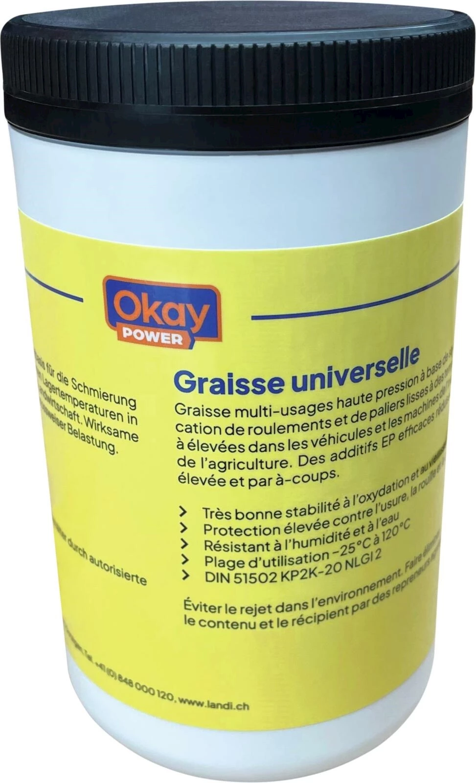 Das Fett überzeugt durch eine hervorragende Oxidations- und Alterungsstabilität sowie einen hohen Schutz vor Verschleiss, Rost und Korrosion. Zudem ist es besonders widerstandsfähig gegen Feuchtigkeit und Wasser, was es ideal für anspruchsvolle Arbeitsbedingungen macht. Das Okay Power Universalfett ist für Temperaturen von -25 °C bis 120 °C geeignet und erfüllt die DIN 51502 KP2K -20 NLGI 2 Norm.