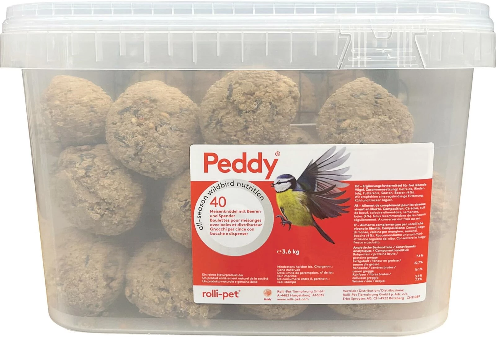 Ergänzungsfutter für freilebende Vögel. Im praktischen wiederverschliessbaren Eimer und mit Spender. 40 Stk. à 90 g.