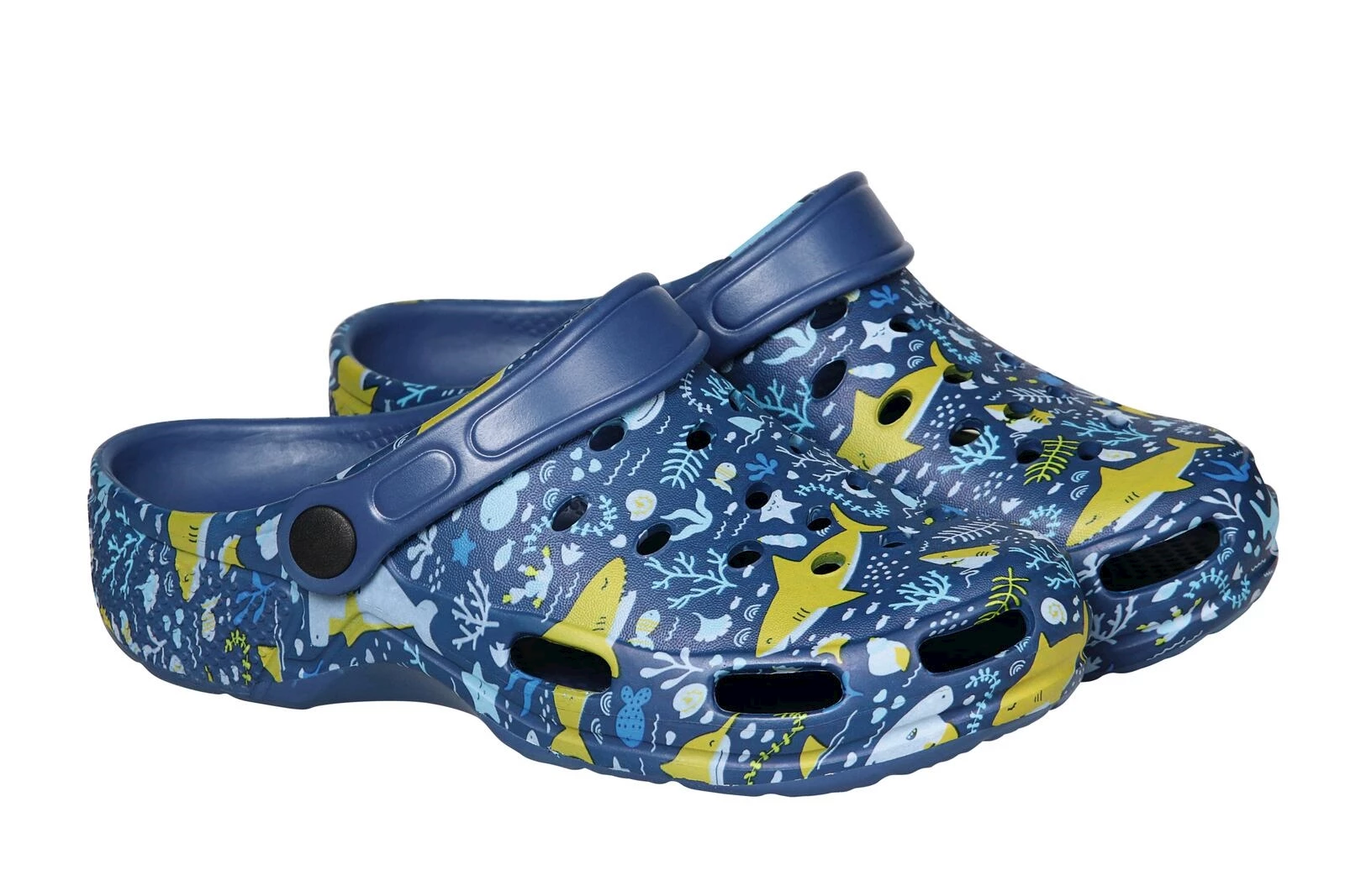 Die Cloggs für Kinder sind die idealen Schuhe für zu Hause und im Garten. Die Schuhe werden aus EVA hergestellt und bieten hohen Tragekomfort und dank der Lüftungslöcher eine gute Luftzirkulation. Sie sind bequem und leicht zu reinigen. Für zusätzlichen Halt am Fuss kann die Lasche nach hinten zur Ferse geklappt werden. Farbe: Blau mit Druck.