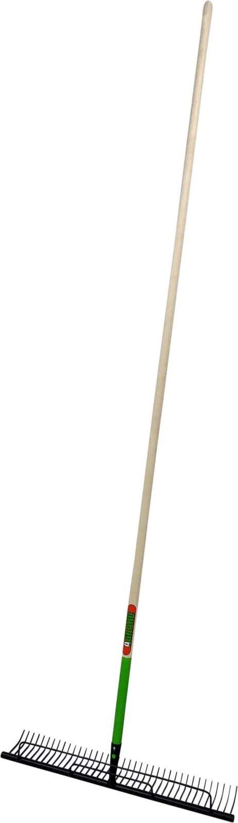 Der Rasenrechen mit einer Arbeitsbreite von rund 70 cm und 39 Zinken ist ideal zum Rechen von mittelgrossen Rasenflächen. Der Rechen hat einen langlebigen Holzstiel aus Esche und eine Gesamtlänge 220 cm. Die mittellangen Metallzinken mit darüberliegendem Bügel sind so konzipiert, dass auch etwas grössere Mengen an geschnittenem Rasen zusammengerecht werden können. Der praktische Rechen eignet sich ebenfalls, um nebst Rasen auch Stroh, Gras, Blätter oder anderes Gartenschnittgut zusammenzutragen.