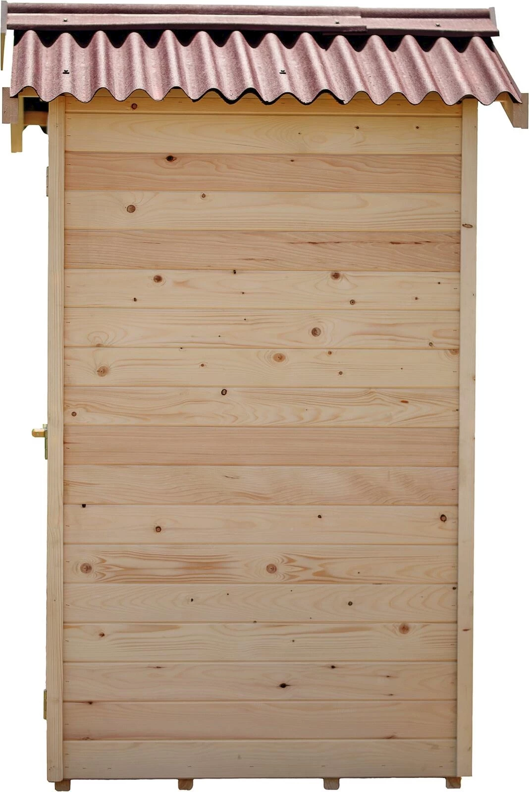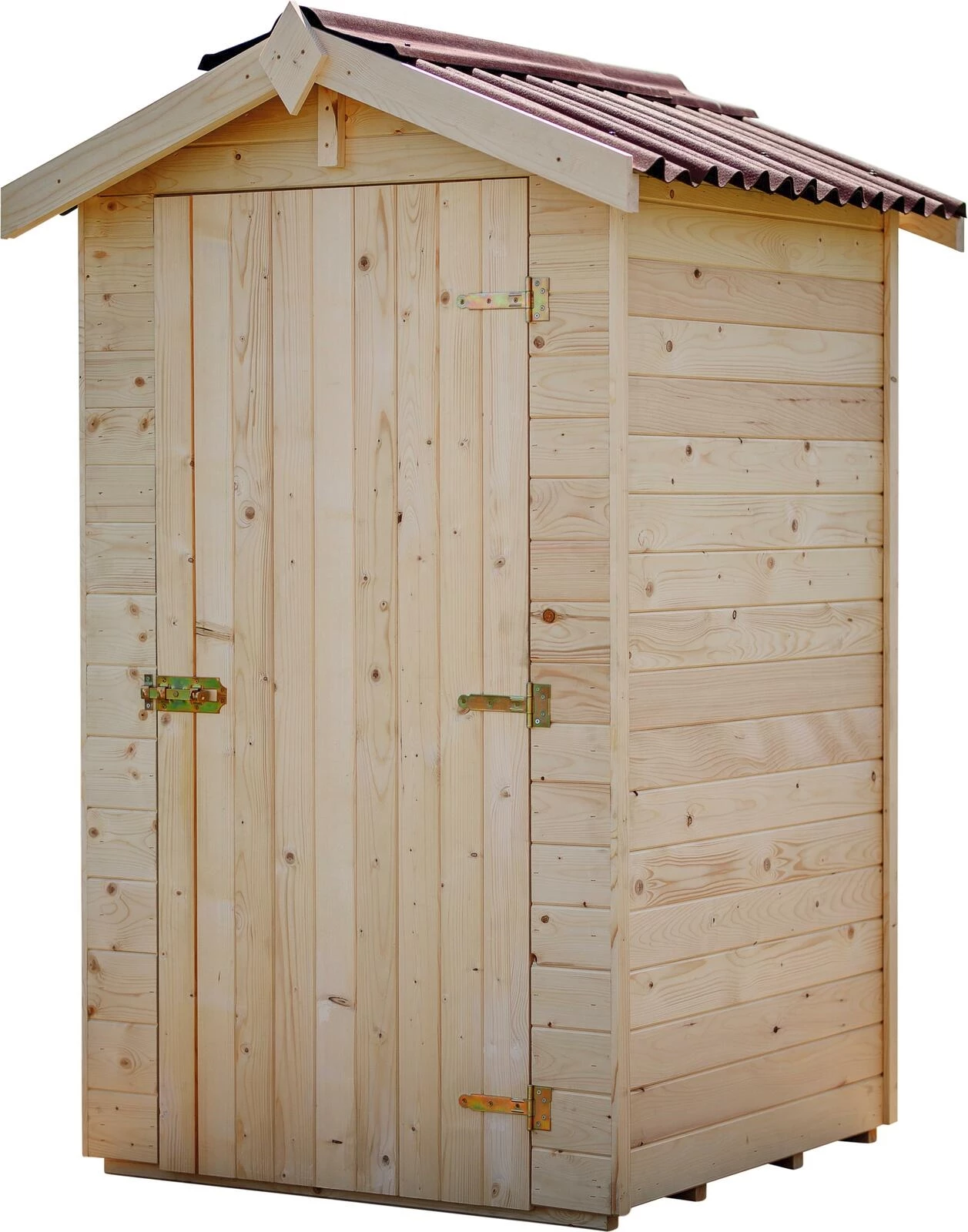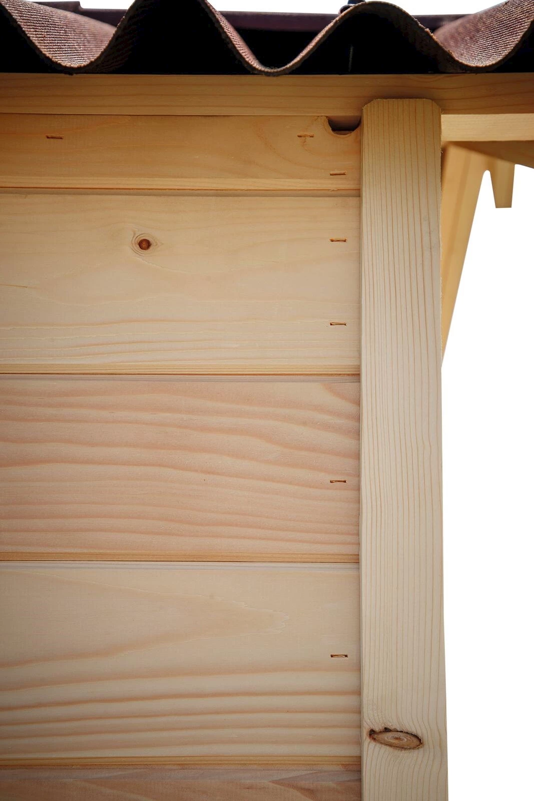 Schönes Gerätehaus mit einer Nutzfläche von 1.2 m ². Einfacher Zusammenbau durch leicht verständliche Montageanleitung. Das Dach besteht aus Bitumenwellplatten und der Boden aus OSB Platten mit Auflagebalken. Das verwendete Holz ist unbehandelt.