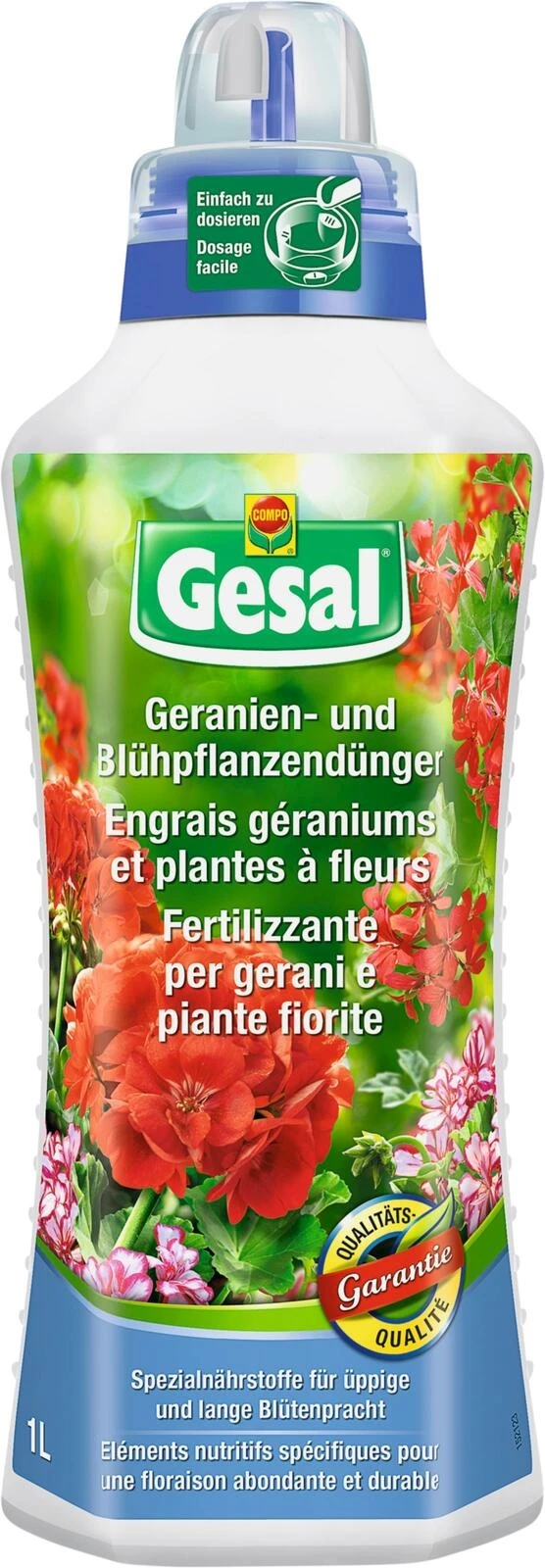 Der Gesal Geranien- und Blühpflanzendünger 1l ist ein speziell entwickelter Dünger für stark zehrende Balkonpflanzen. Diese Nährstoffformel enthält extra Eisen, was zu üppigen Blüten und einem satten Grün führt. Darüber hinaus stärkt dieser Dünger die Widerstandskraft der Pflanzen und stimuliert das Wurzelwachstum. Um diesen Dünger zu verwenden, kann die Dosierhilfe in der Verschlusskappe genutzt werden, was eine bequeme Handhabung ermöglicht. Der Dünger kann einfach mit dem Giesswasser ausgebracht werden, was eine effiziente Anwendung gewährleistet.