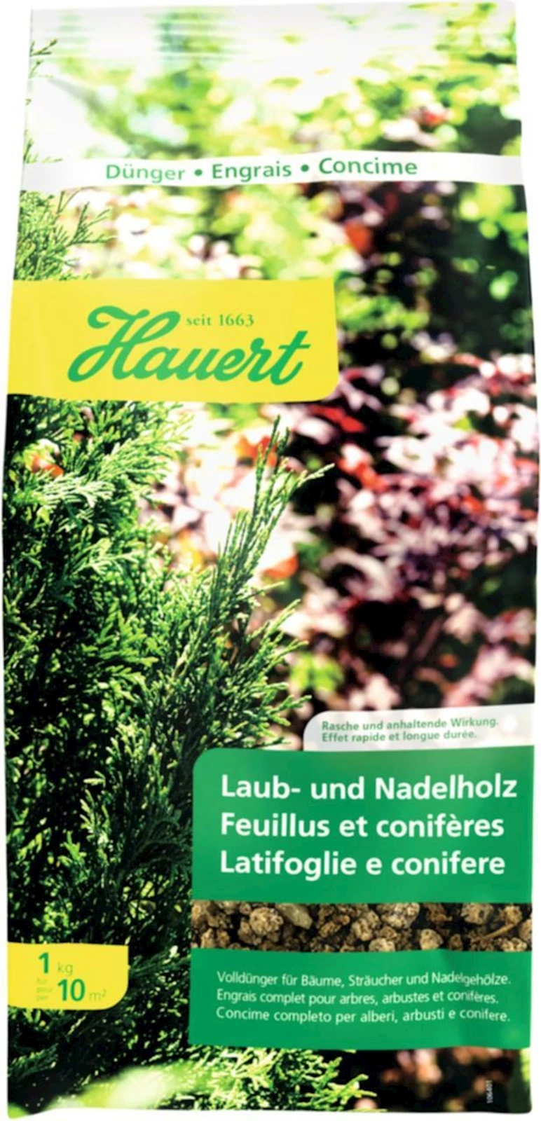 Hauert Laub und Nadelholz ist ein organischer-mineralischer Dünger mit Magnesium und einem Stickstoffgehalt von 6 %. Davon sind 3 % NA Ammoniumstickstoff, 1 % NRf Stickstoff von Methylenharnstoff und 2 % NO organisch gebundener Stickstoff. Der Dünger enthält ausserdem 4 % P₂O₅ Gesamtphosphat, 3 % P₂O₅ wasserlösliches Phosphat, 8 % K₂O wasserlösliches Kaliumoxid und 2 % Mg Magnesium (1,2 % wasserlöslich). Der Dünger ist chlorarm und enthält 35 % organische Substanzen pflanzlicher Herkunft. 50 % des Stickstoffs sind als Langzeitstickstoff (NRf, NO) enthalten. Der Dünger kann trocken und in verschlossenem Gebinde unbegrenzt gelagert werden und leere Packungen können mit dem Hauskehricht entsorgt werden.