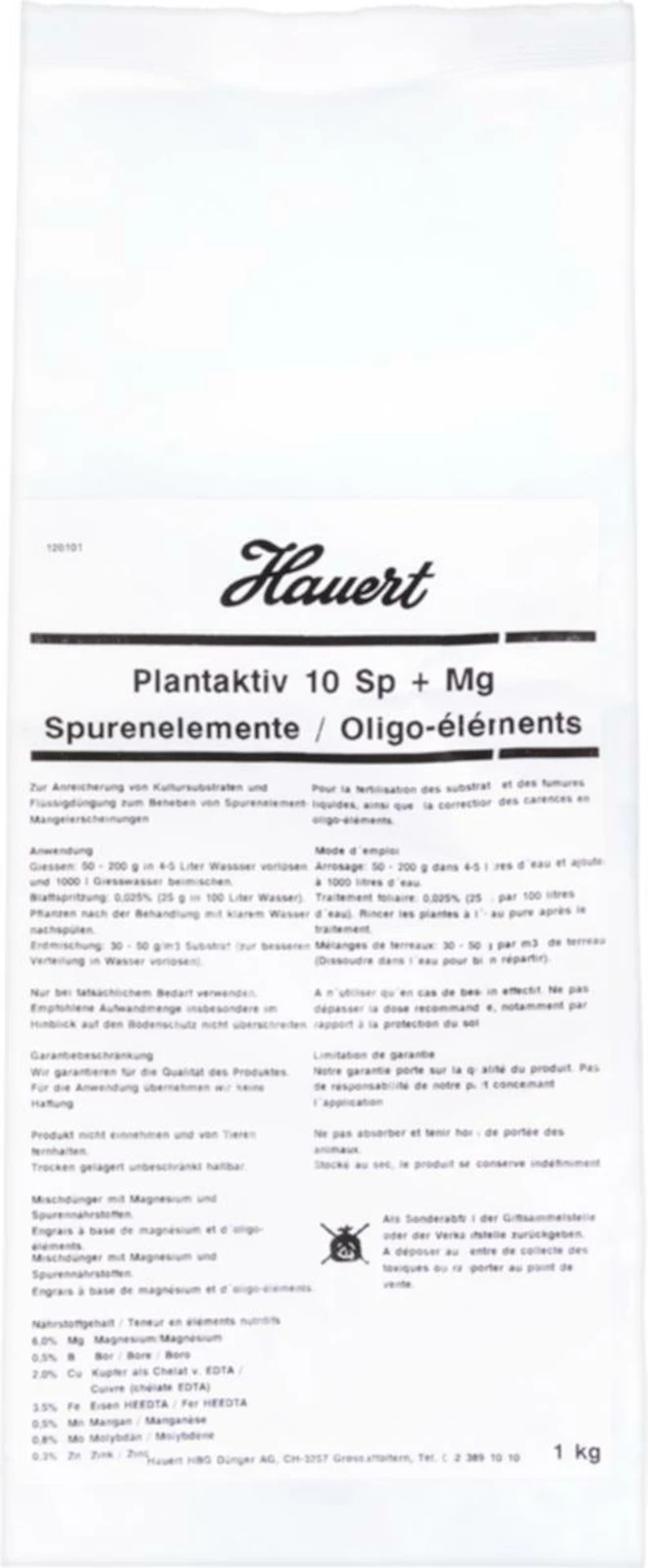 Hauert Plantaktiv SP Hors-sol ist eine wasserlösliche Spurenelementmischung und ein vollständig wasserlöslicher Mischdünger mit Bor (B), Kupfer (Cu), Eisen (Fe), Mangan (Mn), Molybdän (Mo) und Zink (Zn). Dieser Dünger wird verwendet, um Stammlösungen in Kombination mit Einzelnährsalzen für Hors-Sol-Systeme und Substrate auf Torf- und Torfersatzbasis herzustellen.