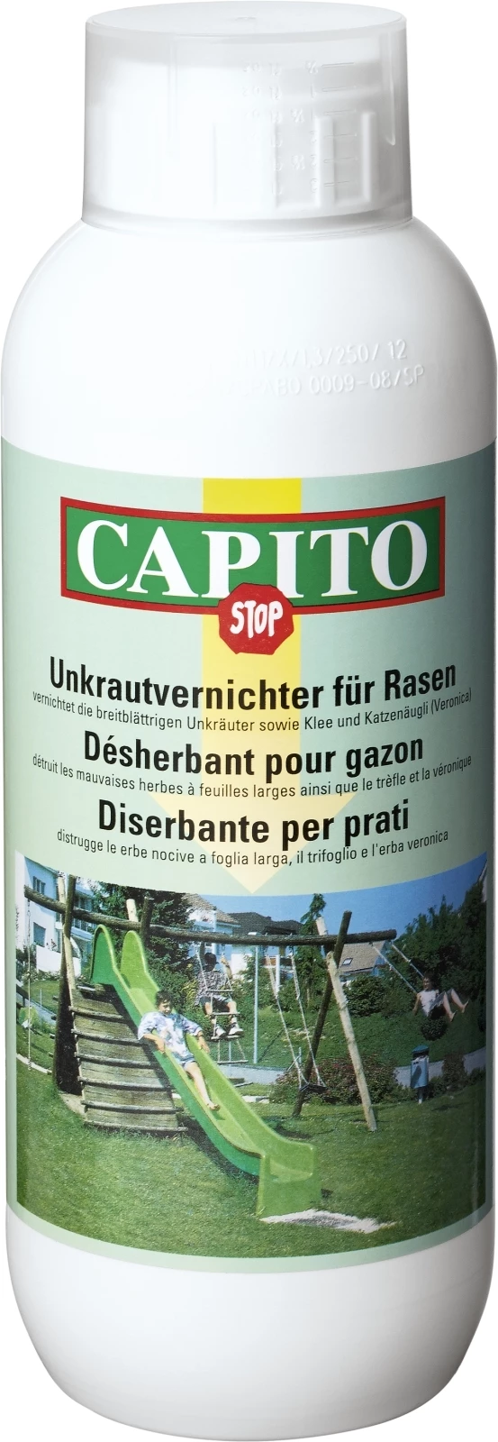 Der Unkrautvernichter Rasen Capito 1 l ist zur Vernichtung von breitblätterigen Unkräuter sowie Klee und Katzenäugli (Veronica) im Rasen geeignet. Die erste Wirkung ist schon nach ca. 5 Stunden sichtbar. Da kein Brenneffekt besteht, wird der Rasen geschont. 110 ml oder 11% von CAPITO Unkrautvernichter in 1 Liter Wasser geben. Gleichmässig auf 10 – 12,5 m² ausbringen. Bei grösseren Unkräuter Behandlung widerholen.