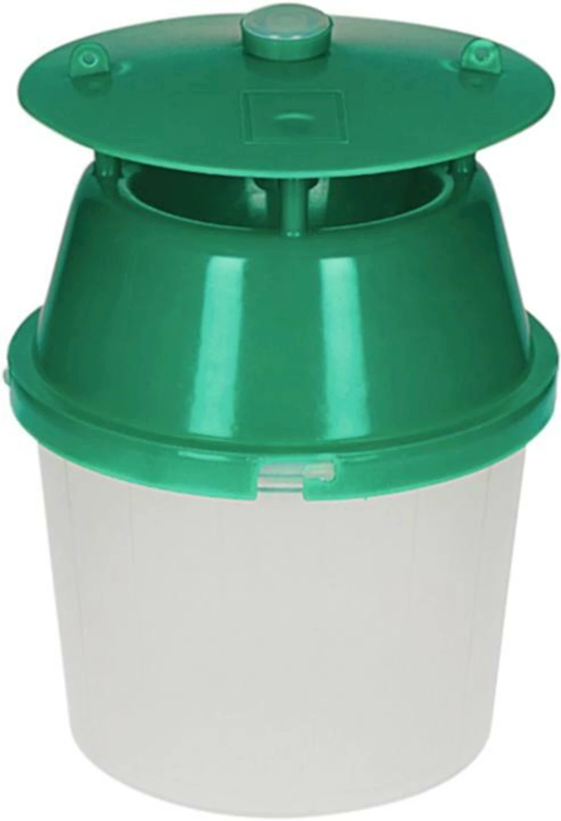 1. Auffangbehälter zu 1/3 mit Wasser sowie ein paar Tropfen Spülmittel füllen. Trichteraufsatz auf den Auffangbehälter setzen und durch seitliches Schieben befestigen.