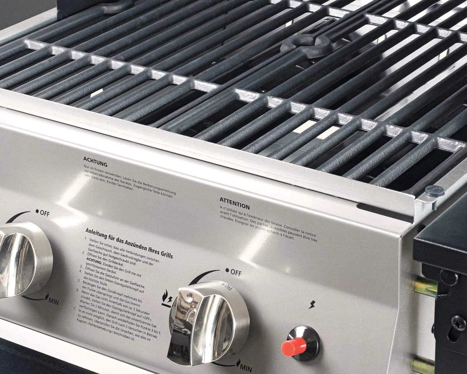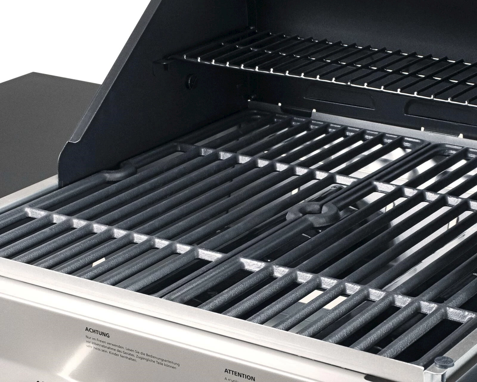 Grill Club. Optimal bis zu 8 Personen. Mit 2 Gusseisenbrennern und 2 Grillrosten aus Gusseisen, Warmhalterost. Klappbare Seitentablare. Unmontiert.
