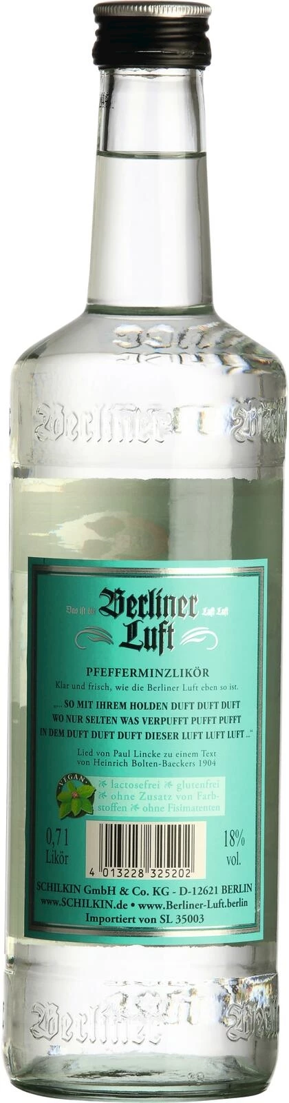 Pfefferminze einmal anders. Berliner Luft Likör wird nach traditioneller Rezeptur in Berlin hergestellt. Sein frischer Pfefferminzgeschmack gepaart mit einer spannenden Schärfe ergeben einen einzigartigen Trinkgenuss. Der Likör wird meist eisgekühlt pur, in Cocktails oder Longdrinks in Kombination mit Orangenlimonade, Ginger Ale oder Cola getrunken, dekoriert mit Minzblättern oder Zitronenscheibe.