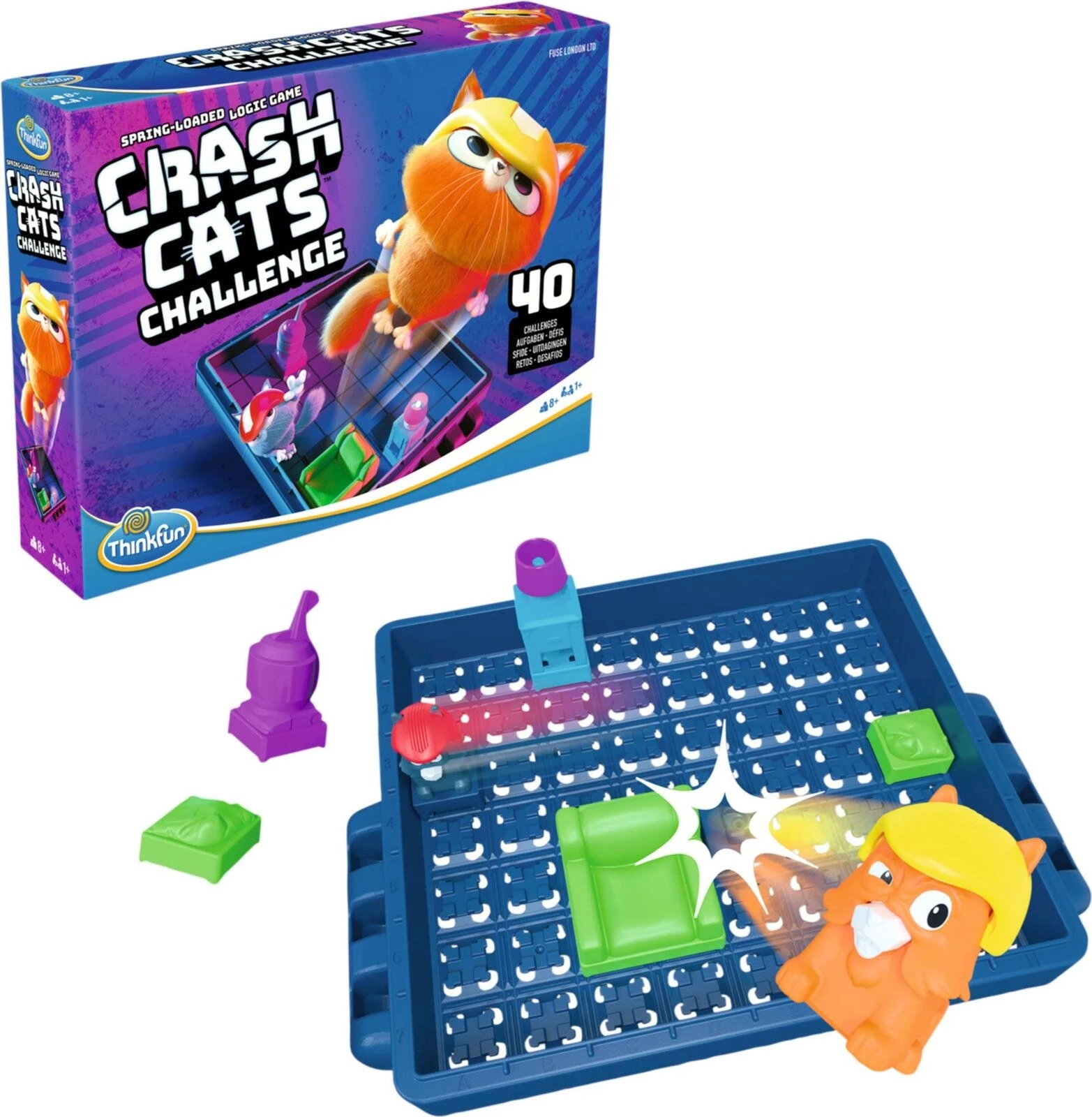 Bei Crash Cats Challenge sind Geschick, Planung und räumliches Vorstellungsvermögen gefragt. Durch vorsichtiges Kippen des Spielfelds rutschen die frechen Katzenfiguren über das Spielfeld, bis sie auf Hindernisse treffen und schwungvoll in die Luft geschleudert werden.