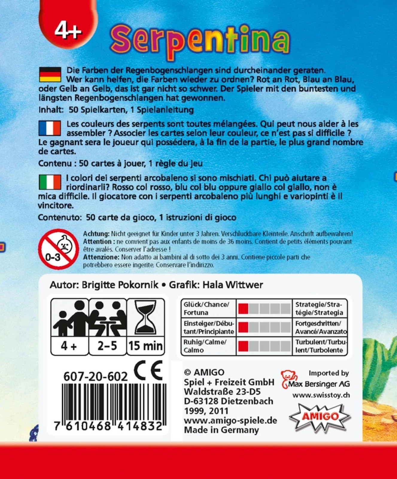 Serpentina ist das farbenfrohe Legespiel für kleine Kinder ab 4 Jahren. Durch das Anlegen farblich passender Karten wächst nach und nach eine bunte Schlange. Ein ideales Spiel, um Farben zu lernen und das erste Regelverständnis zu fördern.