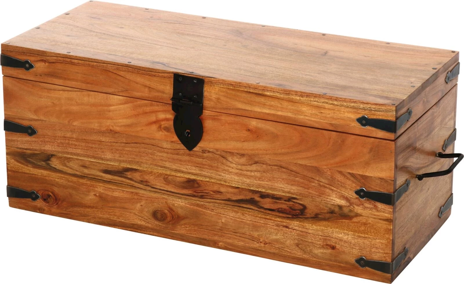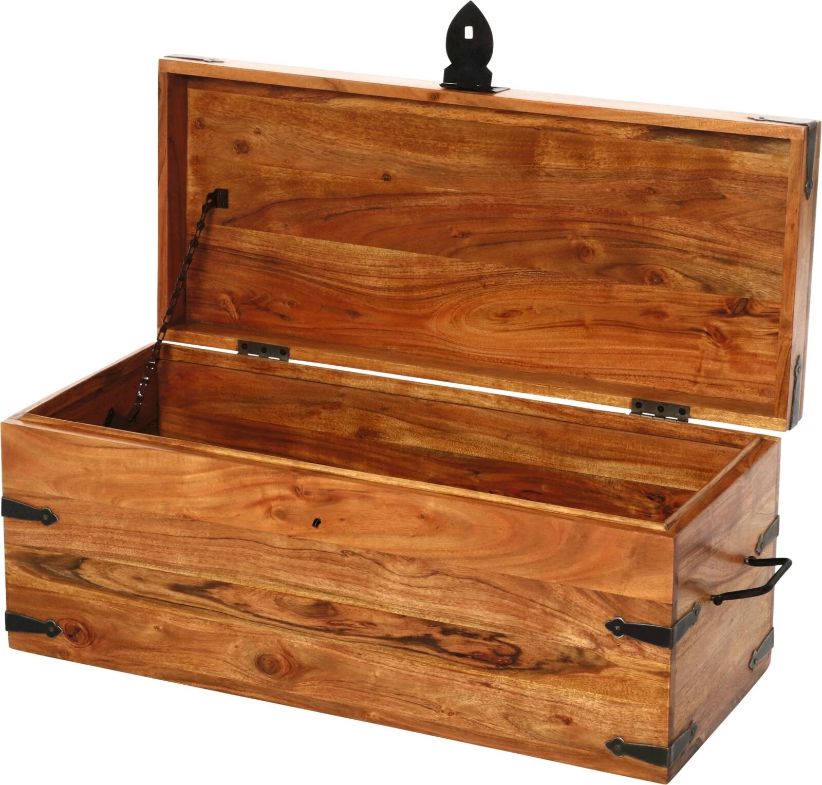 Massive Truhe mit rustikalem Charme. Bietet Stauraum, dient als Tisch, einzigartig durch Naturholzbild, stabil mit Metallbeschlägen. Material: Mangoholz.