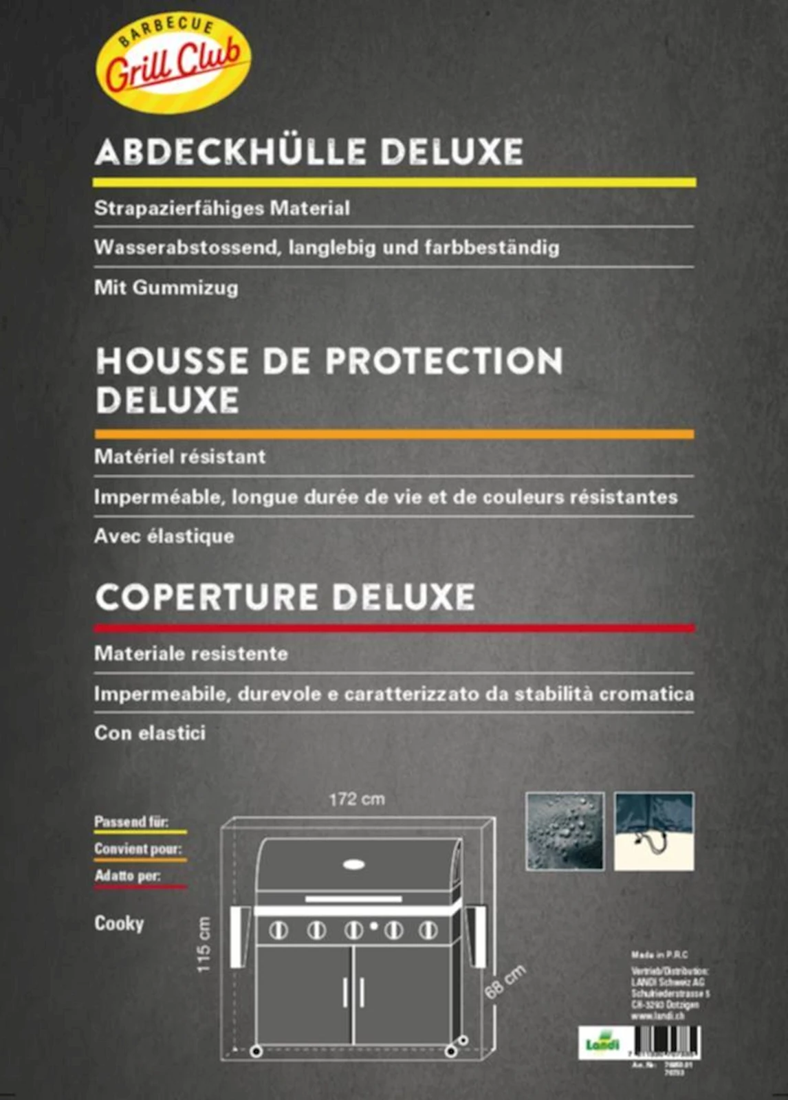 Die Abdeckhaube von Grill Club eignet sich ideal für Grills mit einer Grösse von 115 × 172 × 68 cm. Das Material der Plane besteht aus Oxford welches strapazierfähig ist. Um den Grill optimal vor äusseren Einflüssen zu schützen ist am Ende der Haube eine Schnur mit einem Stopper vorhanden.