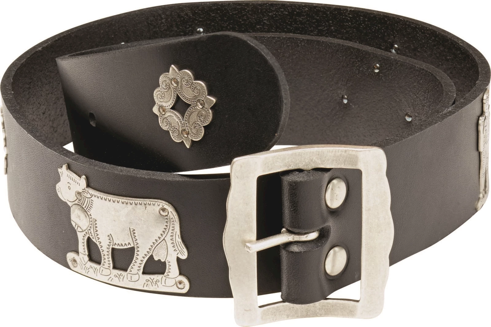 Aus Rindsleder. Schnalle und Beschläge aus Altsilber. Gürtelbreite: 40 mm. Farbe: Schwarz/Silber. Längen: 90/100/110/120/130 cm.