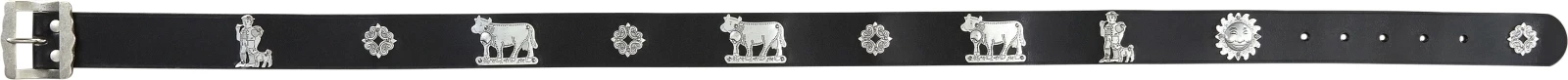 Der Chüeli-Gürtel passt sowohl zu traditionellen Anlässe sowie zur Arbeit. Der Gürtel wird aus Rindsleder gefertigt und hat eine Schnalle und Beschläge aus Altsilber. Die Gürtelbreite beträgt 40 mm. Farbe: Schwarz.
