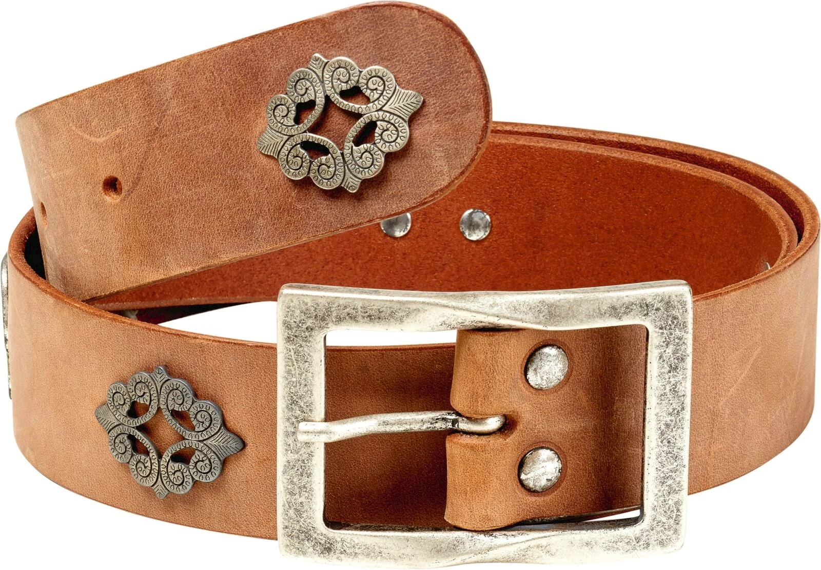 Aus Rindsleder. Schnalle und Beschläge aus Altsilber. Gürtelbreite: 40 mm. Farbe: rot/braun. Längen: 90/100/110/120/130 cm.