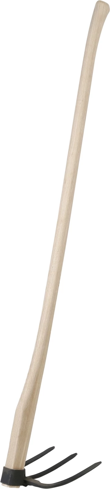 Zur Bodenauflockerung und zur Ernte von Feldfrüchten. Mit Holzstiel. Werkzeugkopf aus Stahl mit 3 Zinken, 16 × 21 cm.