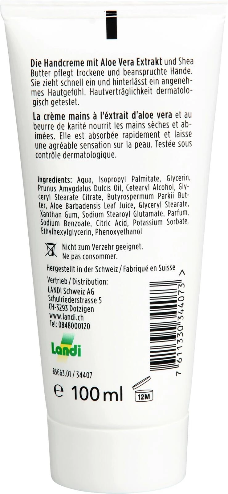 Beauté Suisse. Vegane Handcreme mit natürlichen Extrakten von Aloe Vera und Shea Butter. Pflegt trockene Hände, zieht schnell ein und duftet dezent. Ideal für empfindliche Haut.