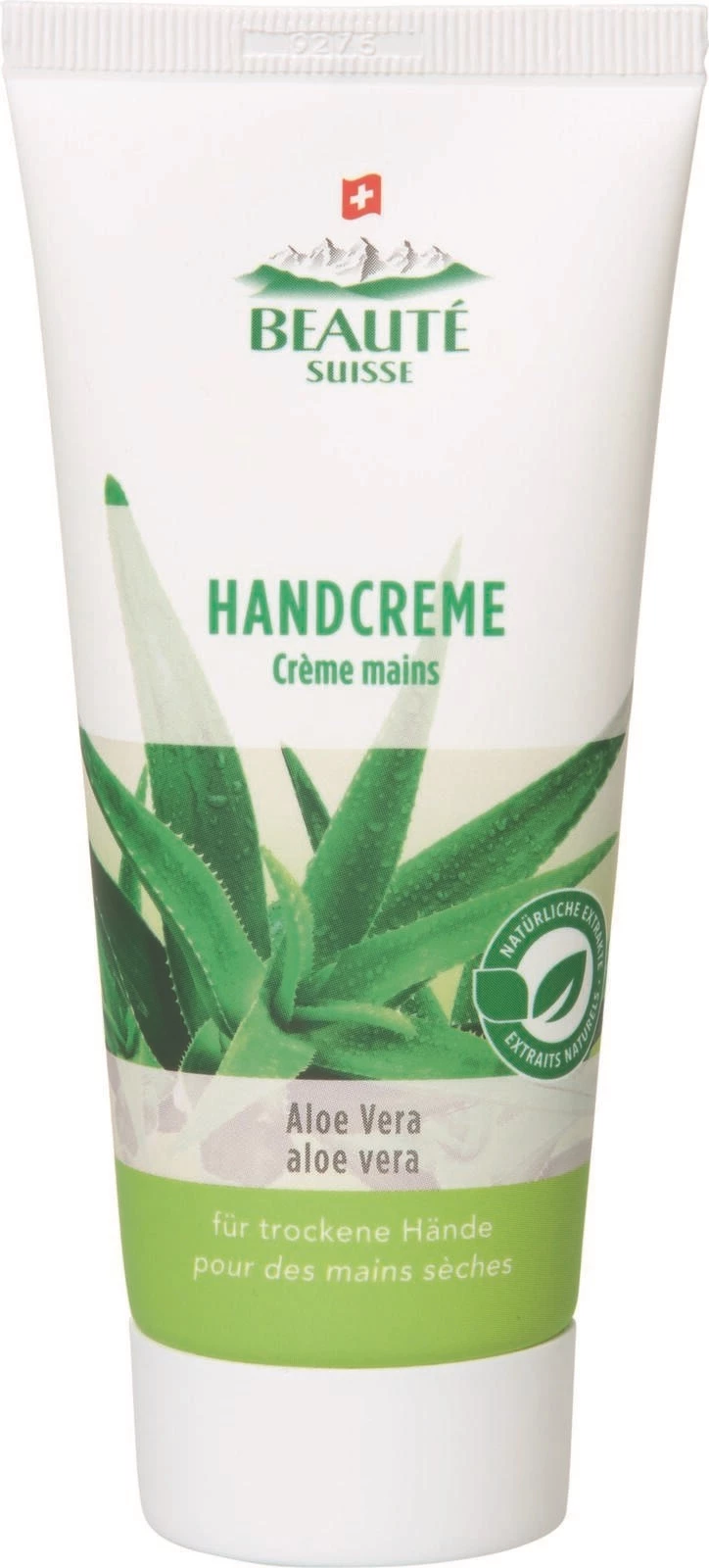 Beauté Suisse. Handcreme mit natürlichem Aloe Vera Extrakt und Shea Butter. Pflegt trockene und beanspruchte Hände. Zieht schnell ein. 100 ml.