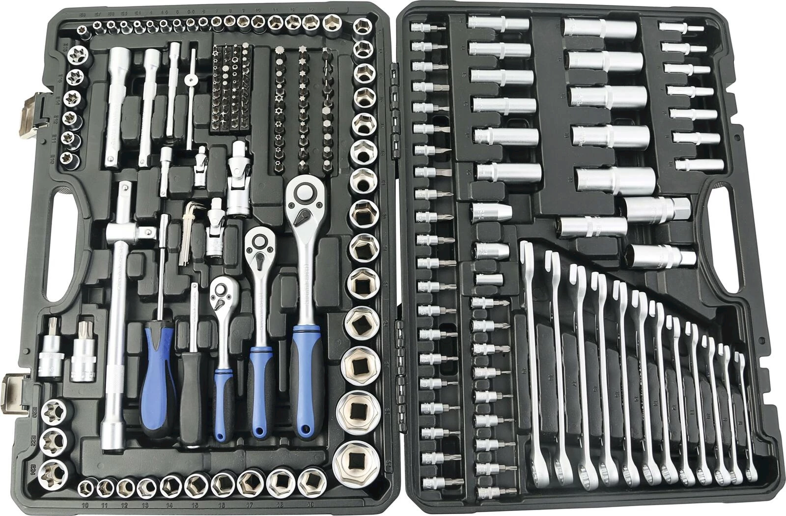 Der 216-teilige Werkzeugkoffer bietet eine umfassende Auswahl an hochwertigen Werkzeugen für den professionellen Einsatz oder den anspruchsvollen Heimwerker. Die Bits und Stecknüsse bestehen aus robustem Chrom-Vanadium-Stahl (CRV), der für seine Langlebigkeit und Korrosionsbeständigkeit bekannt ist. Die Schraubenzieherbits sind aus 6150-Stahl gefertigt und sandgestrahlt, was eine hohe Oberflächenhärte gewährleistet. Alle Maulschlüssel bestehen ebenfalls aus CRV, während die Stecknüsse aus strapazierfähigem 50BV30-Stahl hergestellt sind.
