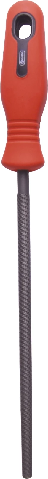 Runde Feile mit Kunststoff-Griff in roter Optik und H2 Zahnung. Die Feile kann für verschiedene Materialien eingesetzt werden. Die Länge beträgt 200 mm.