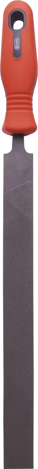 Flache Feile mit Kunststoff-Griff in roter Optik und H2 Zahnung. Die Feile kann für verschiedene Materialien eingesetzt werden. Die Länge beträgt 250 mm.