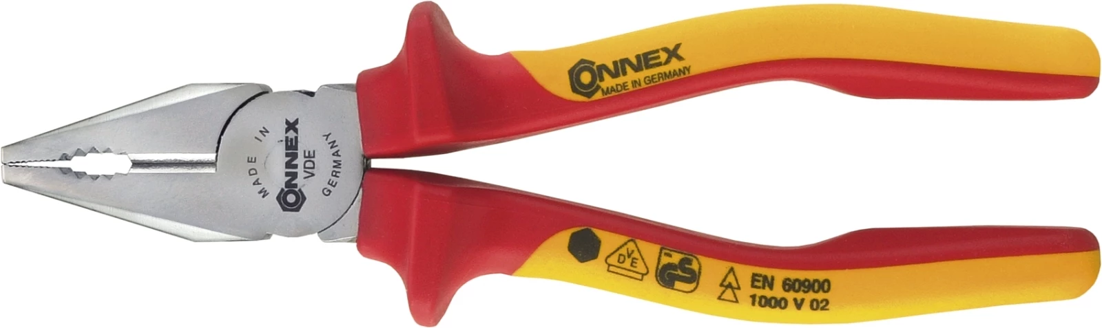 Kombizange aus geschmiedetem und mehrstufig ölgehärtetem Werkzeugstahl. Die langen Schneiden sind induktiv gehärtet und Ideal, um dickere Kabel zu trennen. Greifzonen für flachen und runden Draht.