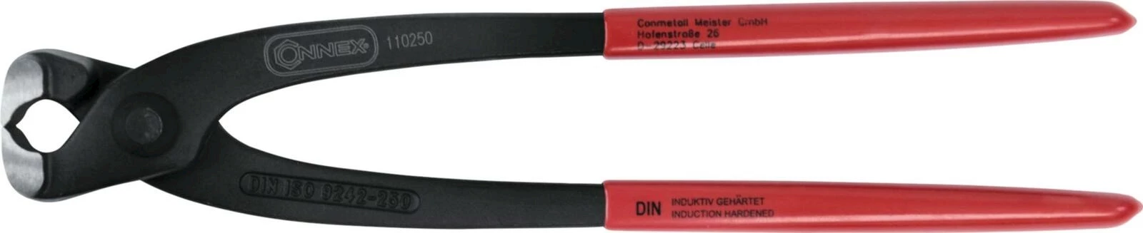 Die Monierzange wird meistens zum Abtrennen und Verbinden von Bindedrähten im Stahlbetonbau verwendet. Der Griff dieser Flechterzange ist mit rotem Kunststoff überzogen und die Backen sind blank poliert. Nach DIN ISO 9243.