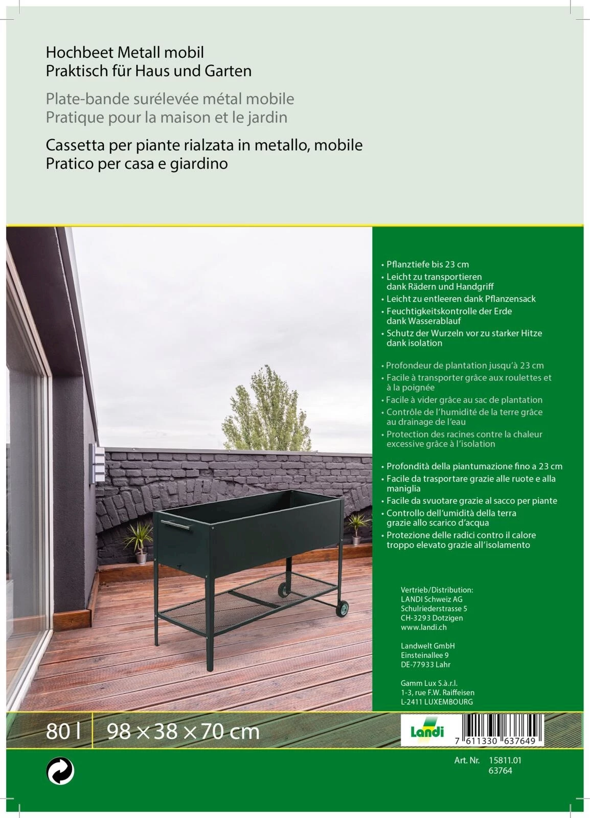 Der Kasten hat eine Materialstärke von 0,85 mm, die Beine sind 1,45 mm dick. Innen ist das Hochbeet mit Styropor und einer Textileinlage ausgekleidet, was für zusätzliche Isolierung sorgt. Dank der praktischen Griffe lässt es sich leicht transportieren. Mit einem Gewicht von 12 kg, einer Pflanztiefe von 20 cm und einem Fassungsvermögen von ca. 70 Litern bietet es ausreichend Platz für diverse Pflanzen. Masse: 83 × 38 ×80 cm.
