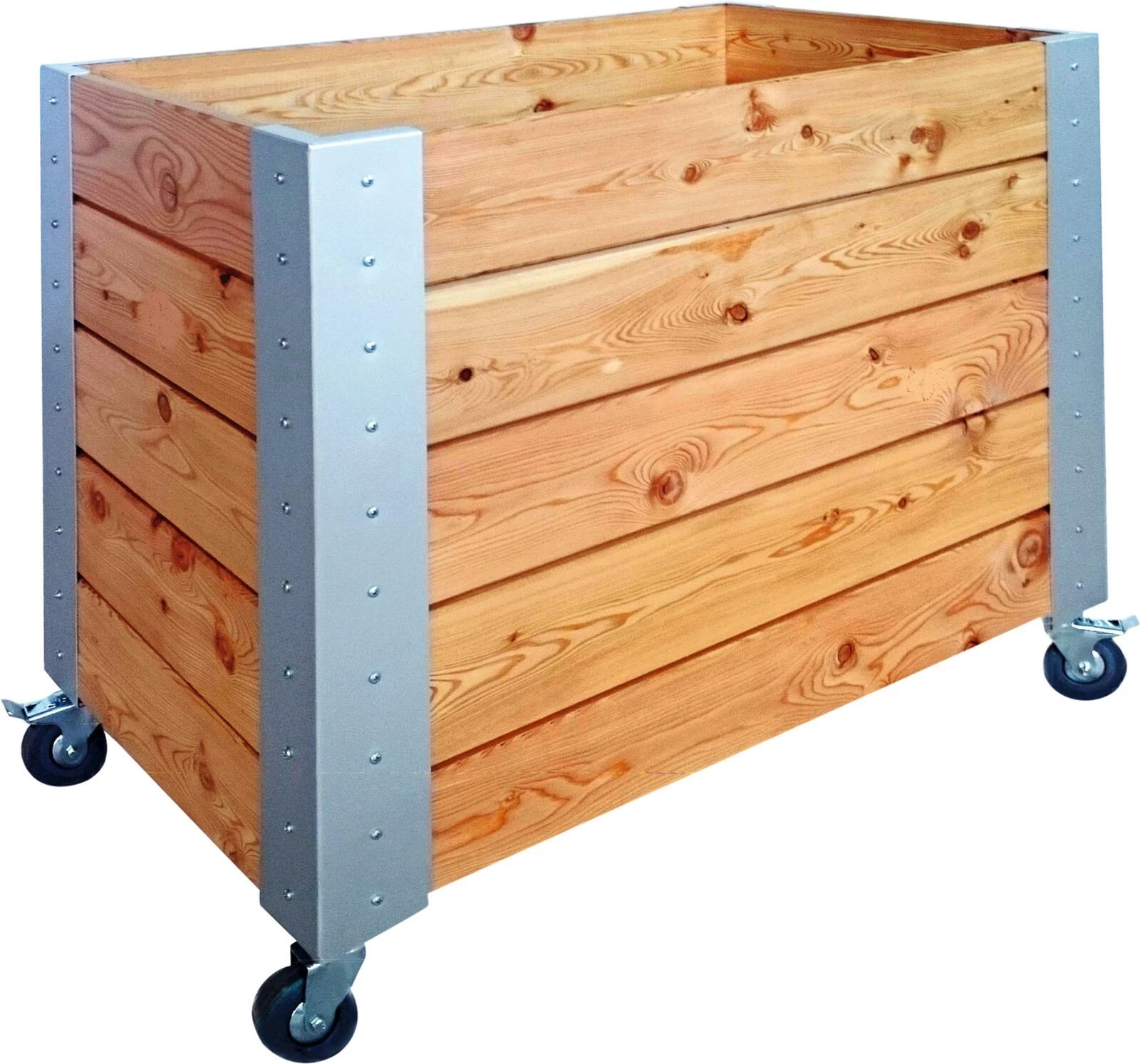 Fahrbares Hochbeet aus beständigem Douglasien Holz mit einer Brettstärke von 2 cm. Die Winkelfüsse sind aus 2 mm dickem Stahlblech, welches pulverbeschichtet ist. Die verzinkten Dreiecke an den Ecken sind 2,5 mm dick. Das mobile Hochbeet steht auf 4 Gummirollen. Beim Kauf enthält das Produkt ein Bodenvlies, Bodenbretter 20 mm, Seitenwandfolie, Montagezubehör und eine Anleitung. Das Füllvolumen vom ganzen Hochbeet beträgt rund 300 Liter. Wenn der Boden in der Mitte eingesetzt wird, reduziert sich das Füllvolumen auf ca. 150 Liter. Masse: 90 × 55 × 73 cm. Gewicht: 32,5 kg.