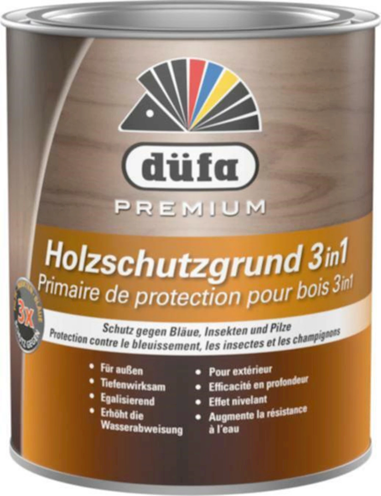 düfa Premium Holschutzgrundierung 3in1 ist ein farbloses, flüssiges, wasserbasiertes Holzschutzmittel mit bioziden Wirkstoffen gegen Bläue und Pilze. Beugt Insektenbefall vor. Für alle Bläue- und Pilz gefährdeten Holzarten, z.B. Tanne, Fichte, Lärche, Kiefer. Einsetzbar auf statisch nicht beanspruchten Hölzern ohne Erdkontakt im Aussenbereich in den Gebrauchsklassen 2 und 3, z.B. Holzhäuser, Vordächer, Holzverkleidungen, Zäune, Fenster und Aussentüren.