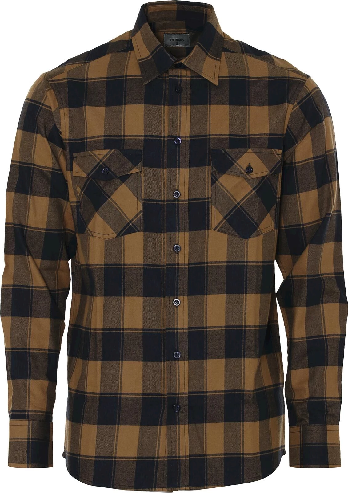 Wörker. Klassisch kariert. Mit zwei Brusttaschen. Aus 100% Baumwollflanell. Farben: Caramel / Navy. Grössen: S - XXL.