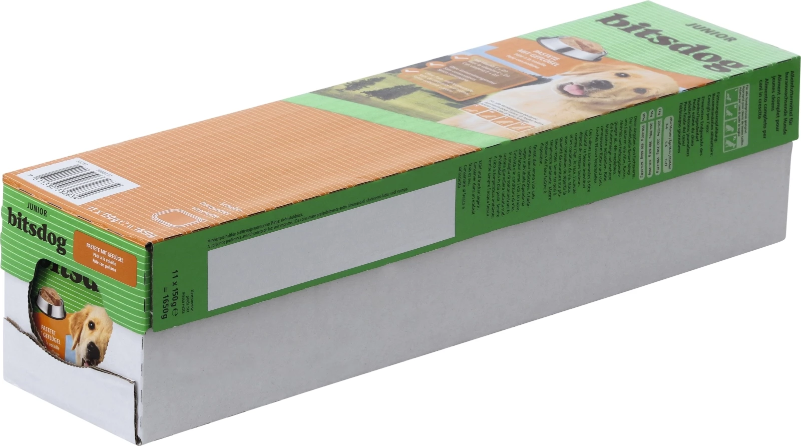 Die Pastete mit saftigen Geflügel von bitsdog ist ein Alleinfuttermittel für heranwachsende Hunde. Sie besteht aus Fleisch, tierischen Nebenerzeugnissen (u.a. 4 % vom Geflügel), Getreide, Mineralstoffe, Öle und Fette. Dem Hundefutter wird mit den Vitaminen E und D3 angereichert. Dem Produkt wird kein zusätzlicher Zucker beigefügt und es ist frei von Konservierungsmitteln.