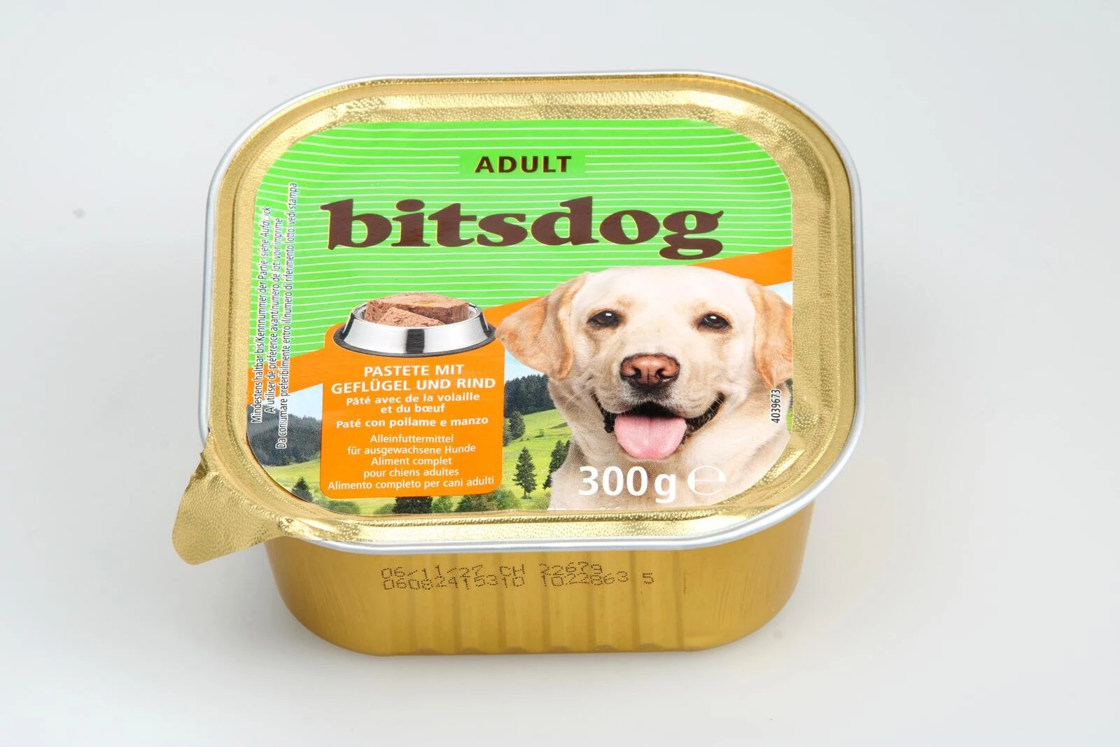 Bitsdog. Nassfutter mit Geflügel und Rind. Ausgewogene Ernährung für ausgewachsene Hunde. Ohne künstliche Zusätze, Farbstoffe oder Konservierungsmittel.
