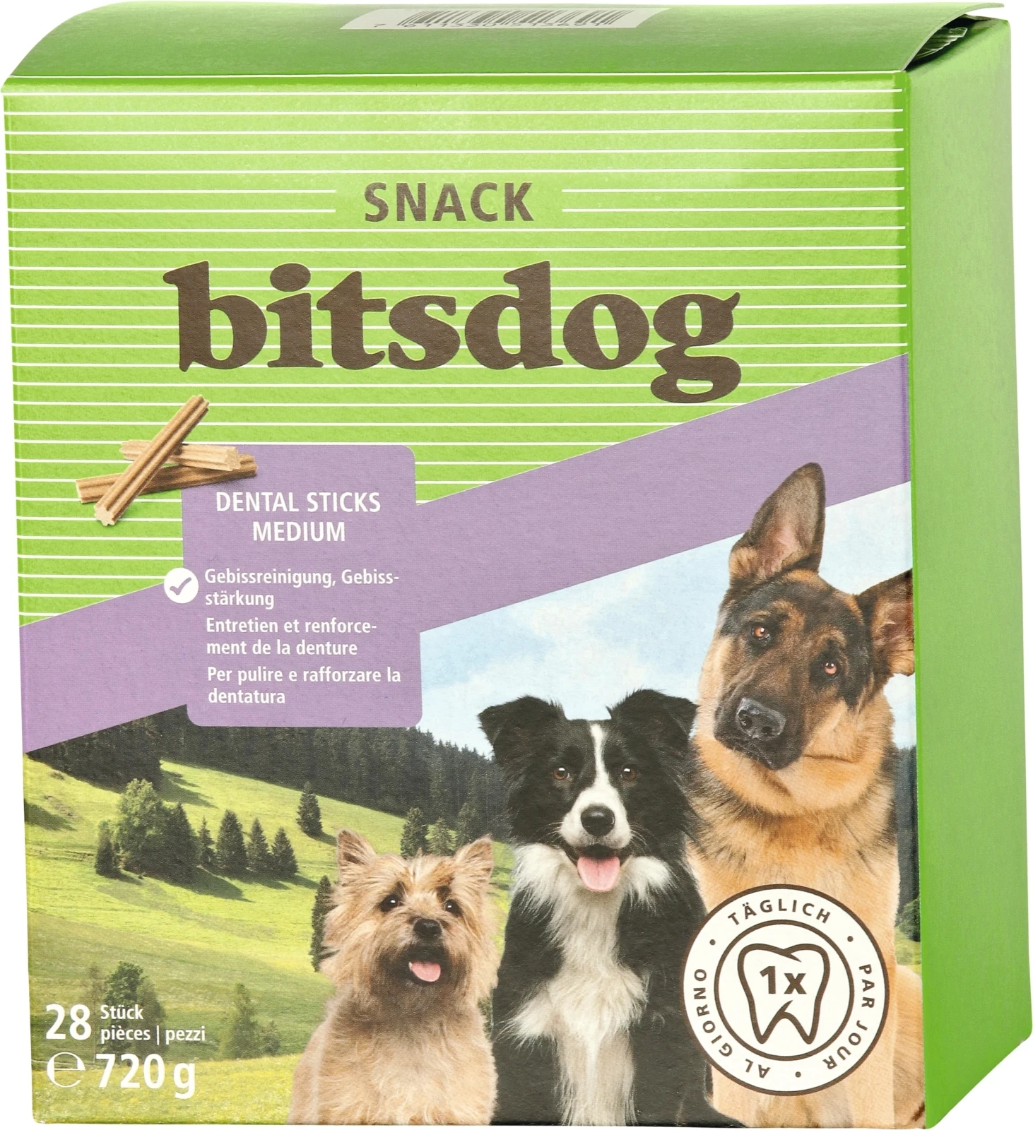 Die Dental Sticks von bitsdog sind ein Ergänzungsfuttermittel für alle Hunde. Sie bestehen aus Getreide, pflanzlichen Nebenerzeugnissen, Fleisch, tierischen Nebenerzeugnissen und Mineralstoffe. Der Snack eignet sich ideal zur Gebissreinigung und -Stärkung Ihres Vierbeiners und er kann sich damit beschäftigen. In einer Packung befinden sich 28 Stück der leckeren Hundesticks.